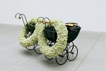 2000, zwei Puppenwagen (um 1900), zwei Kränze aus Islandmoos, 75x115x83 cm
